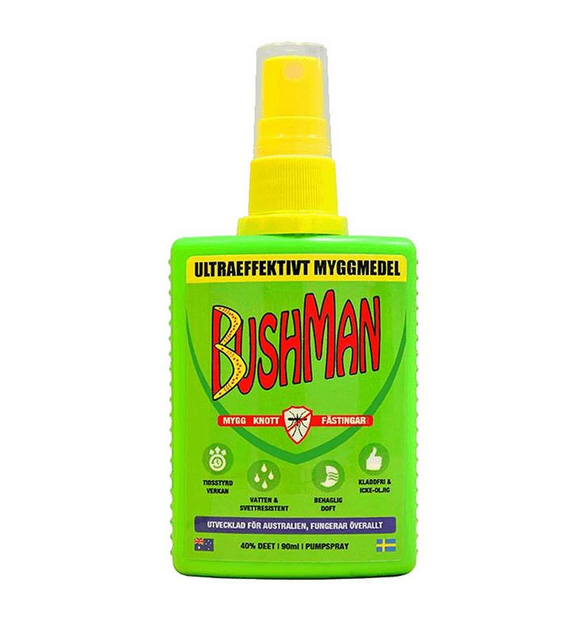 Bushman spray är skonsam mot huden, har en behaglig och neutral doft, och innehåller allergifria ingredienser. Den aktiva ingrediensen i Bushman är DEET, vilken rekommenderas av Världshälsoorganisationen som det mest effektiva myggskyddet på marknaden. DEET utvecklades i USA som skydd mot insektsburna sjukdomar i tropiska miljöer, och är godkänt för användning i Sverige av Kemikalieinspektionen. Bushman ger ett långvarigt skydd mot insekter som mygg, knott, fästingar, flugor och andra luftburna insekter, upp till 15 timmar