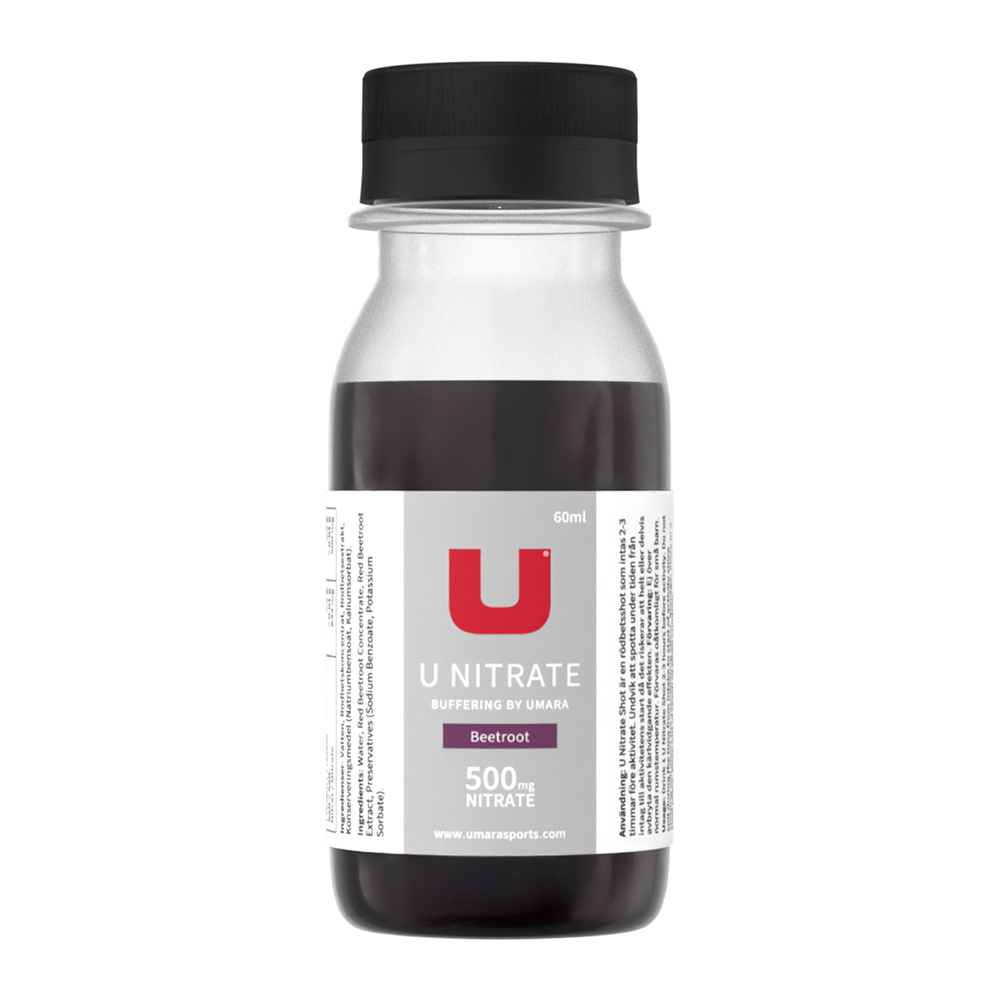 U Nitrate är en koncentrerad rödbetsshot med 500mg nitrat (8mmol) i sig. Vi har valt att öka upp mängden nitrat i U Nitrate från de 400mg som flera andra har, upp till 500mg (+25%). Har du ett VO2max på 60ml/kg/min eller lägre så verkar 500mg (8mmol) räcka. Har du högre syreupptag äm 60ml/kg/min så rekommenderar vi 2 shot (se användningsinstruktioner).